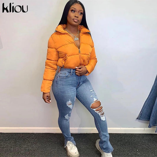 Autumn Warm Jacket Women Solid Puffer Cotton-Padded Zip-Up Coat Two-Pocket Adjustable Top Long Sleeve Turtleneck Jurk