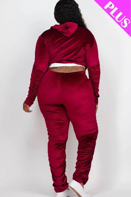 Plus Size Velour Ruched Front Zip up Jacket & Stacked Pants Set (CAPELLA)